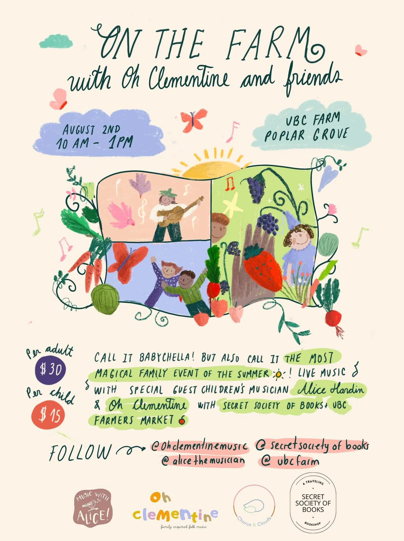 ON THE FARM-A mini music festival presented by Chorus & Clouds, Secret Society of Books and Oh Clementine! August 2nd, 10AM-1PM at UBC Farm, Poplar Grove for ages 0-99!